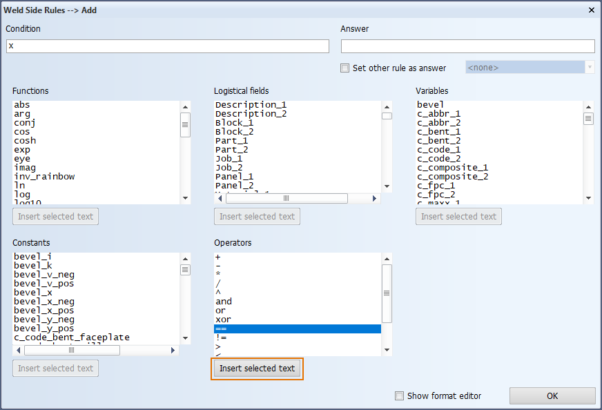 For example, after typing x in the Condition field, you can select the == operator and click Insert selected text below the Operators box.