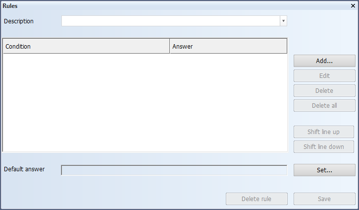 Set – Opens the Set default answer dialog where you can compose an answer that is returned in case none of the conditions are met. Compose the answer by selecting from the available items in the boxes and entering free text.