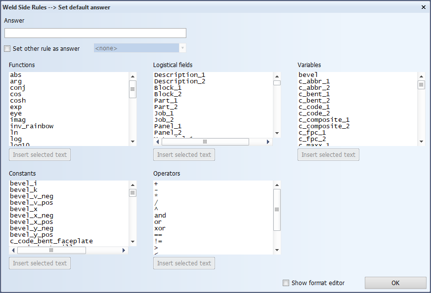 Define the condition and the answer by typing them in the respective fields. In addition to typing, you can also add available functions, logistical fields, variables, constants and operators by first clicking the field (i.e. Condition or Answer) to which you want to add an item, and then selecting the item and clicking Insert selected text.