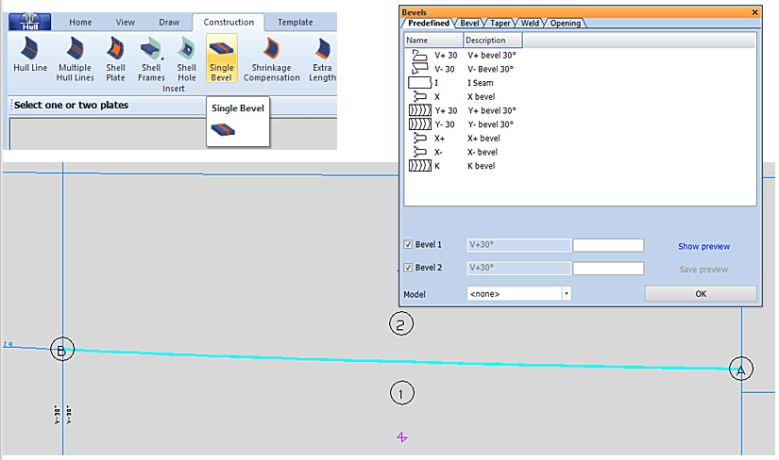 Shell plates can receive bevels automatically if their properties match with one of the rules set in System Management > Construction > Welds/ Bevels > Plate Bevel Rules.