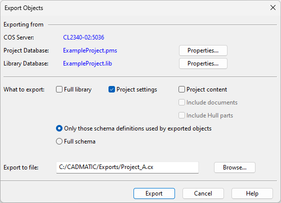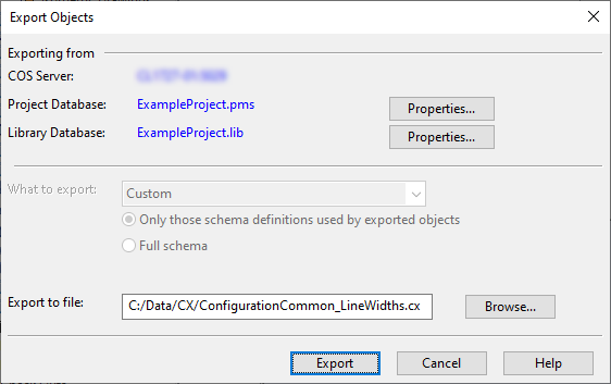 Full library – Select this to export the complete library database. If not selected, only the library objects used by other objects in the export will be included.