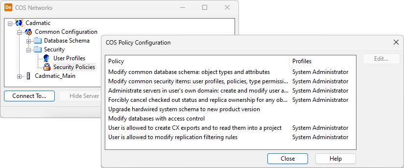 In the CADMATIC desktop, select Object > Manage COS and browse to [server] > Common Configuration > Security. Double-click Security Policies to control access to certain administrative operations by specifying which User Profiles are allowed to perform the operations.