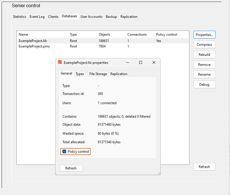 This policy enables forcible canceling of object check-outs and taking or requesting object ownership from replica servers. Note: This policy is required for using the Debug Databases command. |