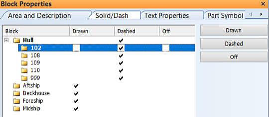 Select a block or block group, and click Drawn, Dashed, or Off to set the blocks to be drawn using a solid or a dashed line, or to not be visible. In general, only the block that is being worked on should be presented as drawn. The other blocks around it can be presented dashed, if it is necessary to see them as well.