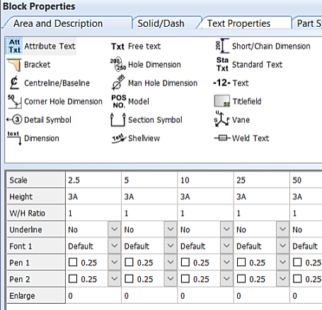 Text properties are set separately for each drawing scale. The columns of the table are ordered by the drawing scale. Each column contains the properties specific to one specific scale.
