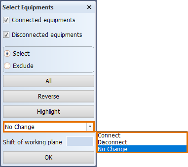 Select either Connected equipments or Disconnected equipments, or both. This determines which type of equipment you can select for modification.