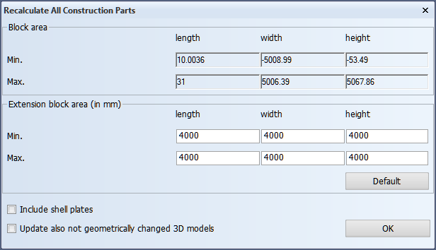 All Construction Parts – Recalculate all the inner construction parts in the block, including templates. Optionally, also shell plates can be included in the recalculation. Only changed parts are recalculated by default.