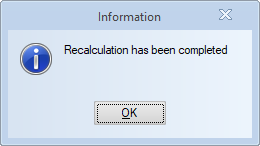 At the end of the recalculating process, the system displays a message window. Click OK to finish the action.