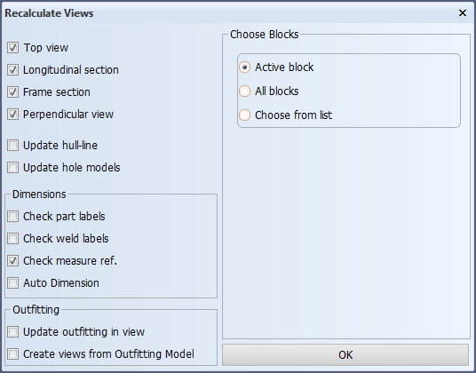 Select which type of view(s) to update: Top views, side views (longitudinal sections), frame views (frame sections), and/or perpendicular views.