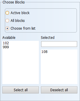 Selecting Choose from list, a selection panel where you can see all the available blocks becomes available. Click on a block in the Available field to select it, or enter the block number under Selected and press Enter. You can remove a block from the selected blocks list by clicking on it.
