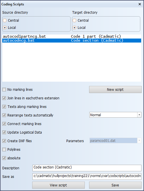 You can choose between these directories in the Coding Scripts dialog, both for displaying the list of scripts (Source directory) and for storing scripts (Target directory). You can copy coding scripts from the local to the central directory this way, and vice versa.