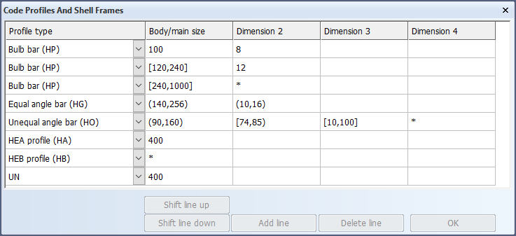 Define which regular profiles are coded as composite profiles. By default, no regular profiles or shell frames are coded as composite profiles. You define the type and dimensions of those regular profiles that the system should code as composite profiles.
