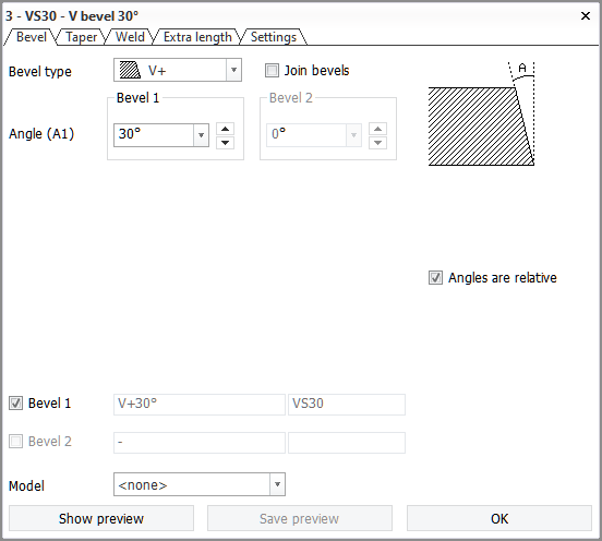 Note: Even though you can define up to 999 predefined bevels, only the first 30 will show up in the bevel selection list in the Green functions in the 3D-Contek application. This means that users can select from a maximum of 30 predefined bevels, regardless of how many predefined bevels are defined.