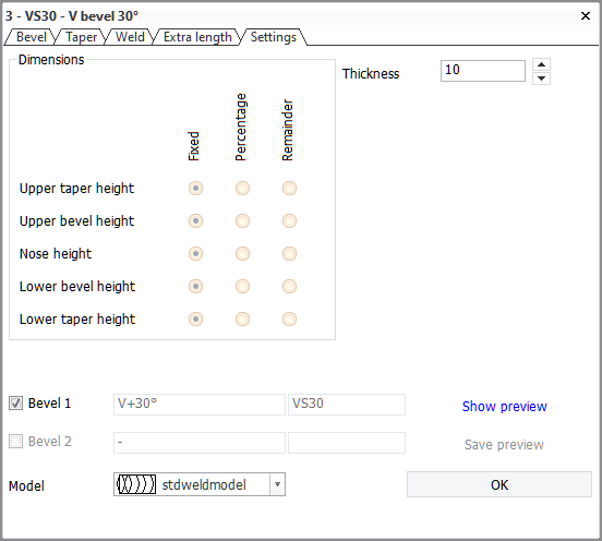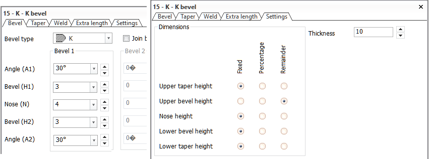 With the settings used here, if the plate thickness is other than 10 mm, the nose height and lower bevel height will stay as is, and the thickness difference will affect the upper bevel height because it is set as a Remainder dimension.