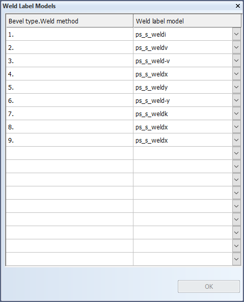 Weld labels are defined by associating weld label models with two weld attributes: bevel type and weld method. Weld method is optional and can be left undefined.