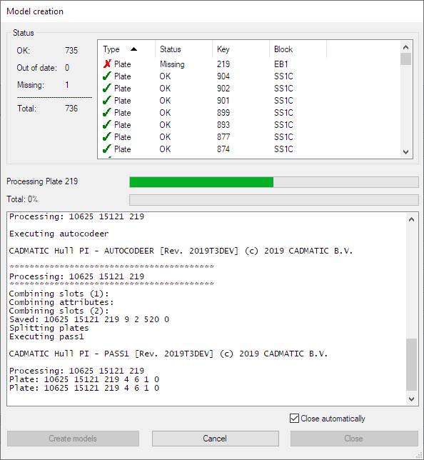 In the Check Out/In dialog, the status of CGF files is checked when saving, saving construction and checking in. If any CGF files are missing or outdated, they will need to be recalculated. In this case, the Model creation dialog opens showing you the progress of the operation.