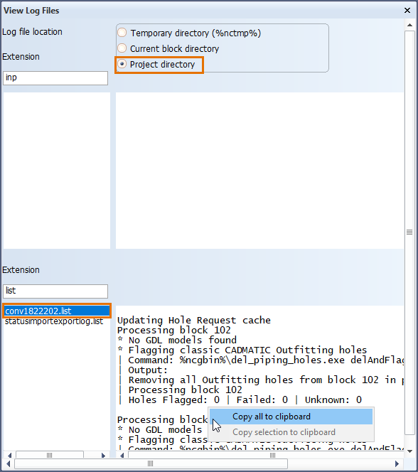 To access the conversion log, go to Hull > Help > Supporting Tools > View Log Files. In Log file location, select Project directory. Then select log file conv182202.list from the list at the lower part of the dialog. You can right-click on the file contents pane to copy the contents to the clipboard.