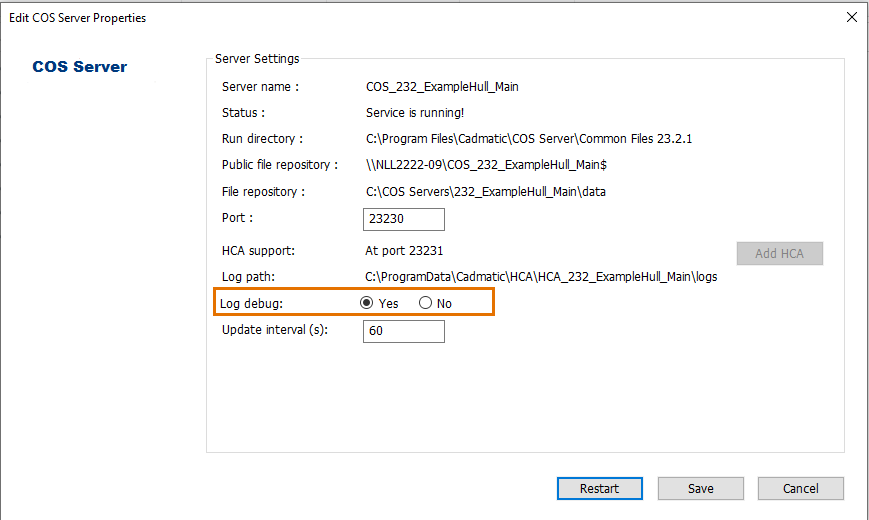 Debugging messages can be included in the log file. This can be done in the COS installer when creating a new COS server or when configuring an existing COS server, by selecting Log debug > Yes.