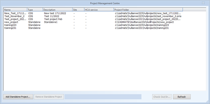 In Project Management Centre (PMC), you can see all projects registered to the hull centre and their administration information, such as which COS servers and databases are used for projects. In addition, you can easily exchange data by opening the Check Out/In from the PMC. This way, you do not need to switch between COS (distributed) projects to update the data to and from the COS server. In the PMC, you can also add and remove standalone (local) projects.