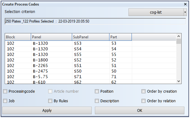 The Create Process Codes dialog displays the number of plates or profiles that have been selected, and an overview of these parts. The previously made selection is the default selection, and is shown in the dialog when the Create Process Codes function is started. A new selection must be made if this selection is not up-to-date any more.