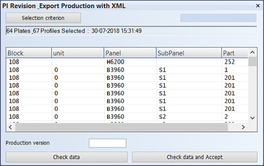 The Production > PI Revision Check function in the 3D-Contek application generates an XML data file of all production information of the parts in the active block, based on the Work BreakDown structure.