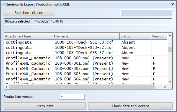 It is recommend to use the Check data action as the first step. The dialog updates to show the status and version of the parts. The version is not changed after the check. The AttachmentType is either cuttingdata (DXF files), or ProfileXML_Cadmatic (profile XML data) , robotdata (.plf files) or partsketchdata (skecthes).