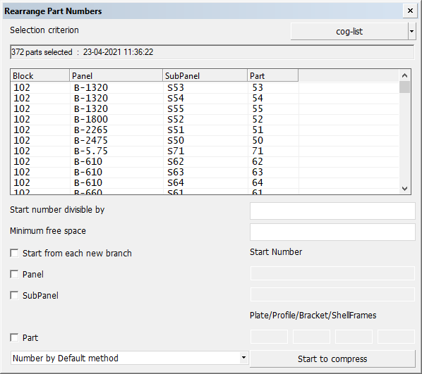 - After this selection fill in the new numbers together with the method and free spaces and start the compress sequence. These actions can be repeated several times until you stop the function with the Escape button. Another panel shows the lowest and highest part number within the selection criteria.