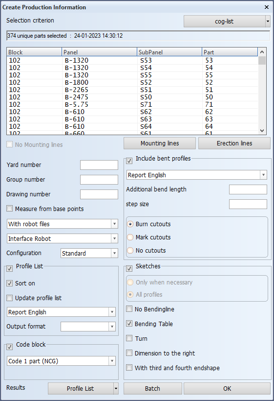 First you select if mounting lines are used or not. If you select to use mounting lines, you must specify them. Then you select the parts for which you want to create production information for. Next you select the desired configuration, and finally you select the output: Profile list sketch, Profile bending list, Profile robot files, Profile sketches, Profile cutting list. You can create the production information immediately, decide to start the process at run-time, or do it in batch mode.