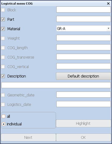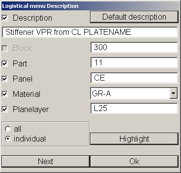 With the normal selection method it is possible to select one or more items. The values of the first selected part appear in the Logistical menu Description dialog. When only one part is selected, option individual is preselected and all the fields are active. After changing the values and clicking OK the logistical information of the part is stored to the database.