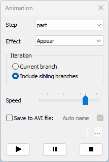 Iteration defines how the animation iterates through the branches. When Current branch is selected, the animation stops at the end of the selected branch. When Include sibling branches is selected, the iteration continues with the branch of the same level below the selected item.