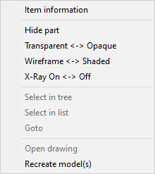 By selecting one of the available options you can change the display state of all the selected parts. These options, except Hide part act more like toggle options. For example, by selecting Transparent <-> Opaque all the transparent parts become opaque and vice versa.