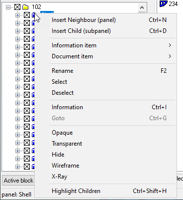 In the image Insert Neighbour option will create a new block and Insert Child will create a new panel. The Insert Neighbour option cannot be selected if the pointed item is not editable or if it has no children. The Insert Child option cannot be selected if the pointed item's child is not editable or the pointed item has grandchildren.