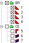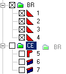In the example below the contents of the branch (subpanel) BR is moved to the branch (subpanel) CE. After saving this action, the parts 1, 2, 3 and 4 belong to the subpanel CE. If the logistical field [Assemblyorder] is present, which is the case in the example below, the moved parts will remain in the same order and they are appended to the new branch. Otherwise, the moved parts are alphabetically reordered.
