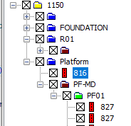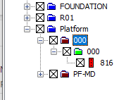 In the example below Part 816 was dropped as direct child of 'Platform', which in this project is 'Level_03', instead of where it should normally be (child of 'PF01', which is of a level called 'Level_01'). Part 816 does not currently have a value for levels 'Level_01' and 'Level_02'. In such case the skipped levels get the name '000', as has been defined as the default value for them in the Hierarchies.