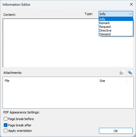 With the Information item function you can insert information items to the work breakdown structure. The following types of information items can be inserted: Info, Remark, Request, Directive, Demand.