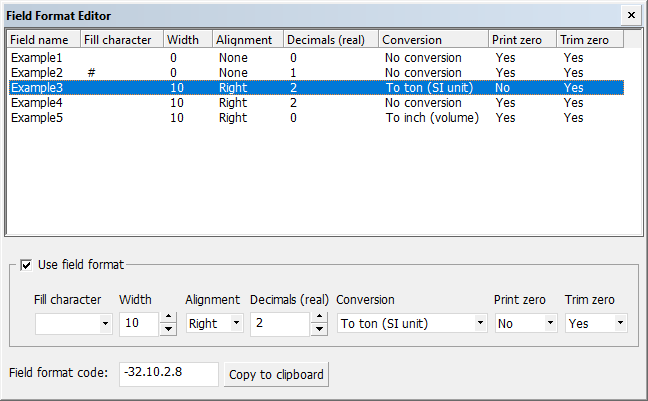 For several settings the format of each separate "field" can be defined in the field format editor.