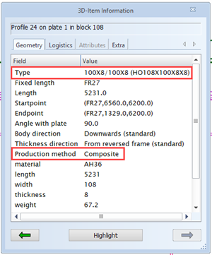 In case of a non-composite profile, the Type field of the 3D-Item Information shows the attributes set in the Presentation > Profiles > Dimension Text settings of the System Management application. By default the 3D-Item Information shows the type and dimensions of the profile.