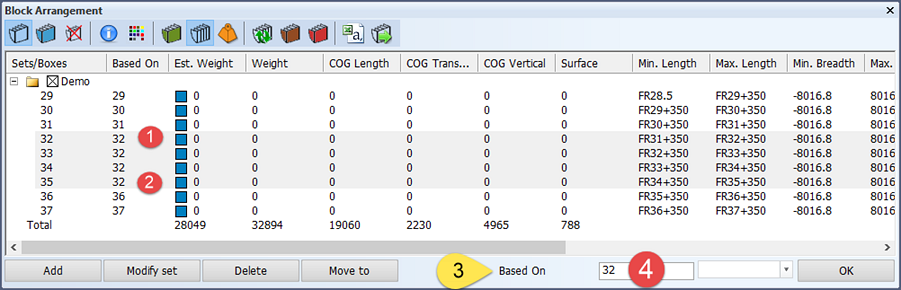 - Shift-click the last Based On value to be changed (2). You can also Ctrl-click to select non-consecutive items. All the selected blocks are highlighted.