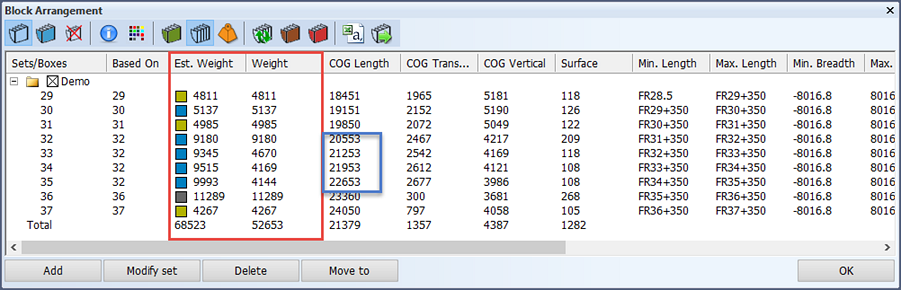 Note the difference between the estimated weight and the actual weight of the blocks with and without relations (red box). Blocks 1-3 show how the varying amount of construction is normally unhelpful since the values vary widely. However, since block 4 is fully defined, this block can be used as the reference construction for blocks 5-7, to provide much more accurate estimations of the weight and COG. Note in the blue box how the COG is now based upon the reference construction, and gets the correct offset of +3mm.