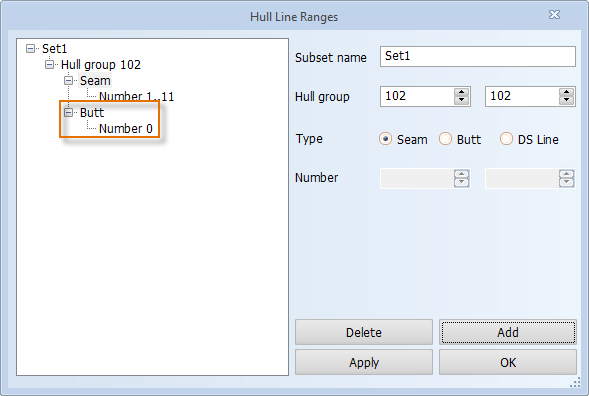 Add additional hull groups, types or numbers by selecting the desired item in the tree and then defining the values. For example, if you want to add a new type to a group in Set1, first select Seam in the tree, then select the new type and click Add. The type is added below the selected group in Set1: