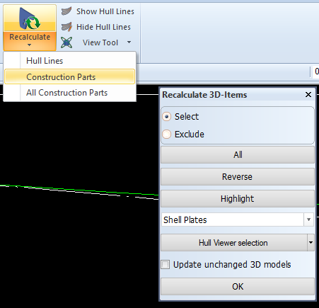 - Select one or more shell plates to be recalculated by indicating them in the graphical window. You can refine the selection by selecting Shell Plates from the drop-down menu.