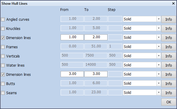 There are two separate rows for Dimension Lines. The difference between them is that the first displays all dimension lines present in the shape database, while the second displays all dimension lines created in the Shell application of CADMATIC Hull. Activate both rows and click OK.