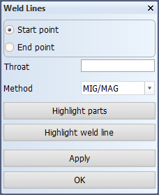 After clicking either Apply or OK, a check is made if the weld points are defined properly and a positive throat height has been entered. The weld line is created if this check passes, otherwise an error message is displayed. The weld line is not presented in the drawing until after this panel is closed so it will not appear immediately after pressing Apply which does not close the panel so that the user can continue adding weld lines to the selected parts. However, the weld line will be displayed after pressing OK which will also close the function and update the drawing. If the function is closed without defining any new weld lines then no updates will be done on the drawing.
