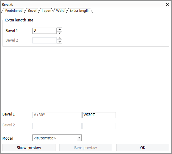 You can adjust the properties of predefined bevels while inserting or modifying single bevels in the 2D-Contek & 3D-Contek and Shell applications, in the Bevel dialog which opens when you start the insert or modify function. The Predefined tab is active when you start the functions. Select the predefined bevel that you want to insert, or to apply if you are modifying an existing bevel.