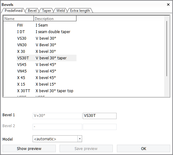 The system administrator can define predefined bevels in System Management > Construction > Welds/Bevels > Predefined Bevels.