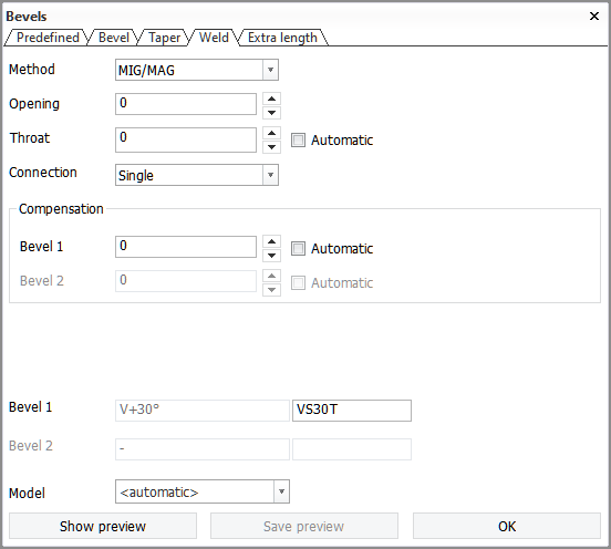 When Automatic is selected, the system will calculate the compensation automatically based on the rules set in System Management > Construction > Welds/Bevels > Compensation Rules.