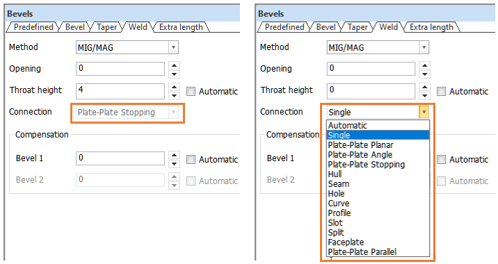 When inserting a bevel, the connection type which is applicable for the situation is shown. When modifying a bevel, the connection type which has been set when creating the bevel is shown. The connection type can only be changed if the type is Automatic or Single.