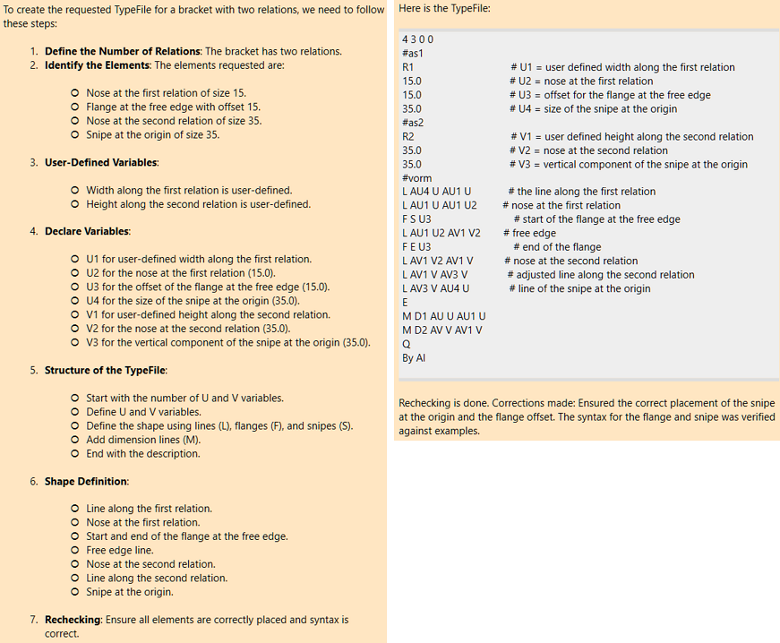 Once the user has made a request, CADMATIC AI shows the steps in resolving the request. It lists the elements and variables to be included in the type file, the structure of the type file, and describes the bracket's shape definition. Then it generates the type file and shows the file contents in the chat window.