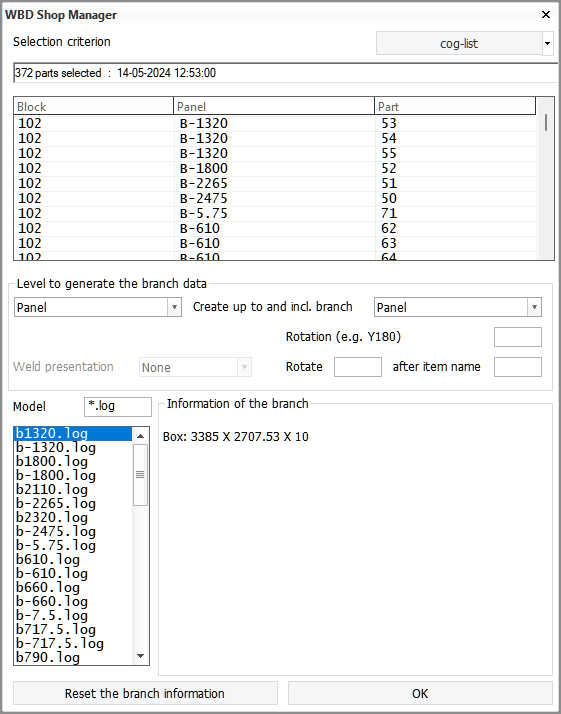 Logistical information defined in the workshopprocess logistical menu is shown under Information of the branch. The box size of the selected branch is always shown (Length x Width x Hight). Note that rotating the models in the branch affects the box values of the branch.