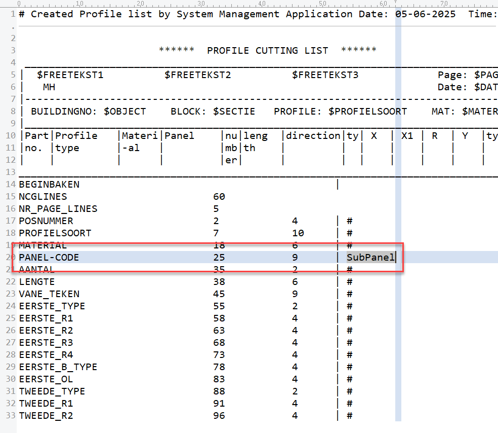 For example, to have the value of the logistical field SubPanel shown instead of the panel name displayed in your profile list, you can add this manually at column position 55 in the corresponding layout file (the <profile_list_name>.ind file in the norms folder):